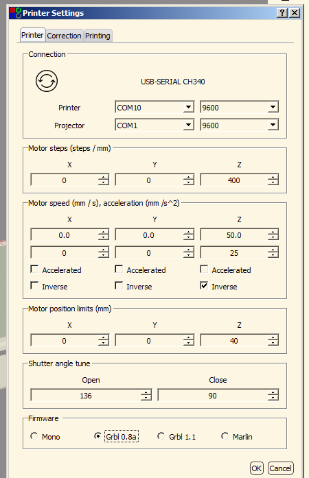 for acceleration; default value for GRBL 0.8A is 25.