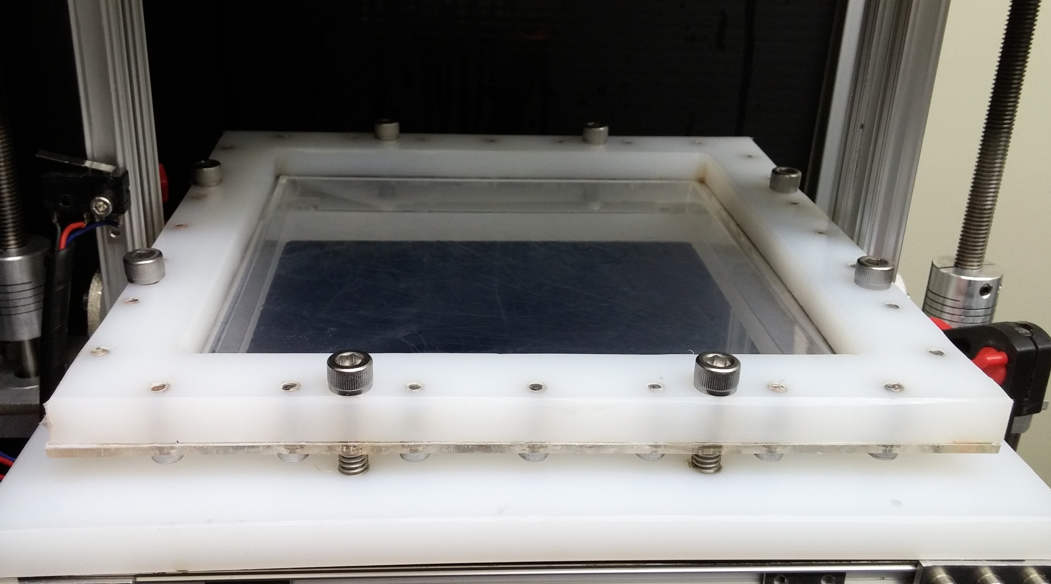 Here is my version on a mUVe DLP. It is a work in progress so don't look to close. The first pic is the lower portion showing the acrylic tension walls. The second is the complete assembly with the 0.005" FEP pulled down taught. I think a tension system is a must. I'm still playing with exposures as they are too high at the moment (16s). I removed a PC sheet I was using for protection but that didn't seem to help much. I have to look at my projector settings next. Once I have the exposure set correctly I have had no issue with sticking to the FEP. This FEP sheet has seen about 25 parts and has a few scratches from poor cleaning procedures.