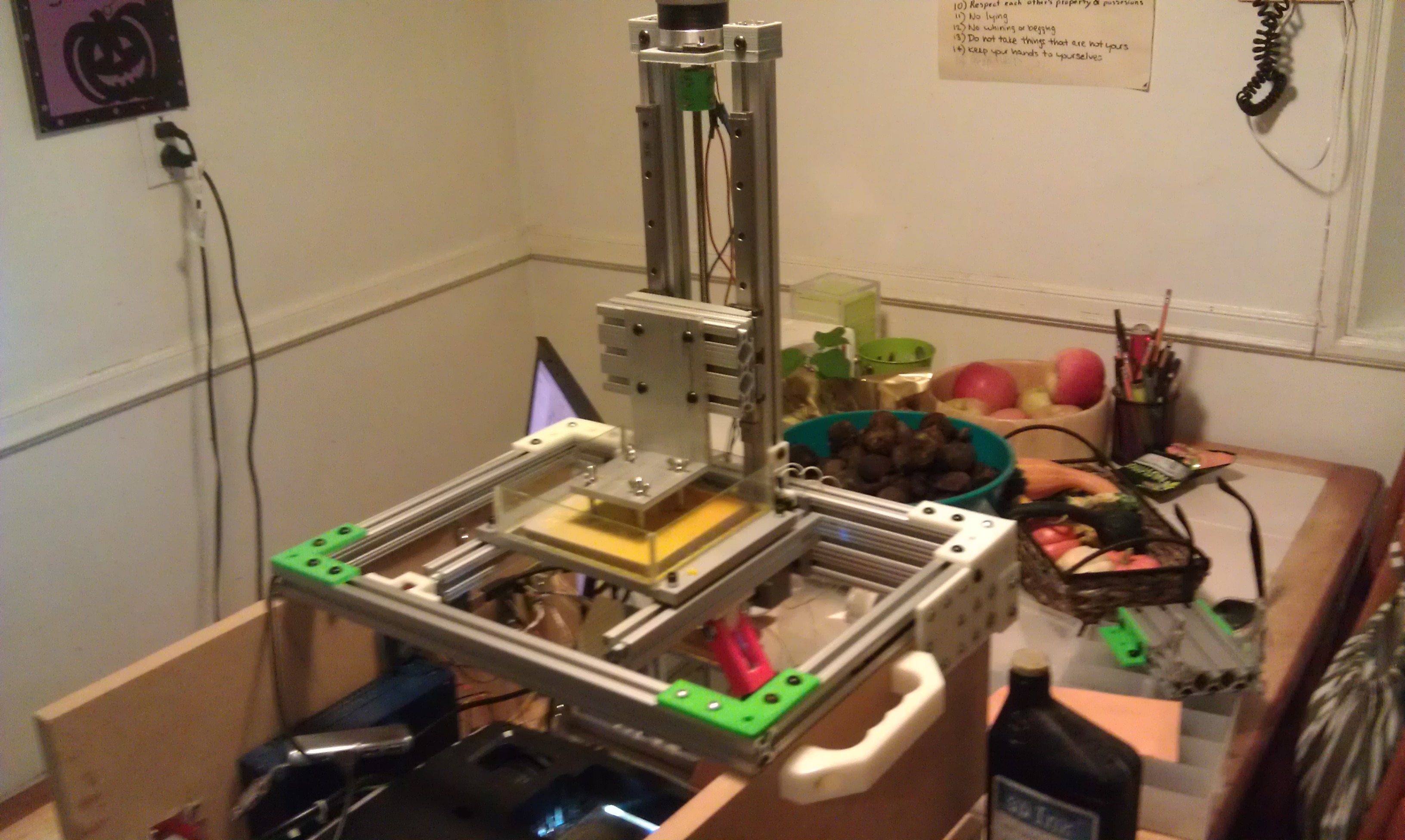 I've got a bottom-up machine with an Infocus 2104 projector. Attached is a good overview shot. It can print objects 120x100x250mm in size at a X/Y resolution of 100 micron and 50 micron in the Z Axis.