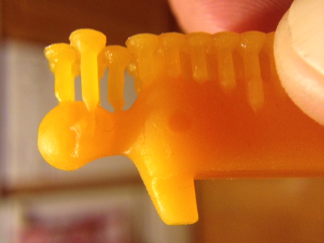 This part took about 20 minutes to build at 0.1mm layer height, using MakerJuice Sub G+. I am very pleased with the resolution but I made the supports a little too big - I can't break them off without damaging the part. I'm now working on settling the resin more quickly between layers.