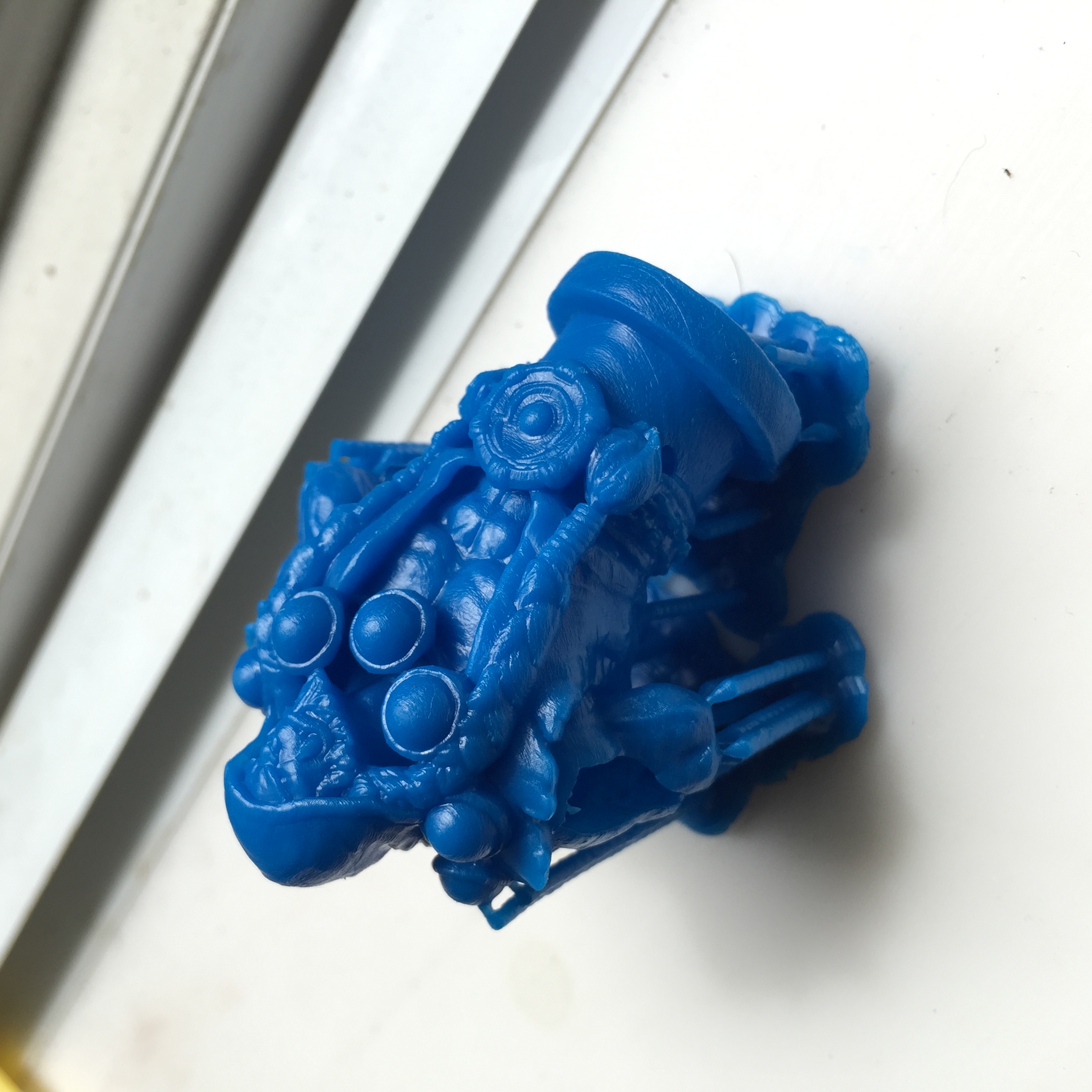 Last night I decided to try a print at 25 micron Z layer height to see if a simple top-down setup would be able to maintain such a small layer height with any uniformity. To my surprise, the final print looks amazing, no visible layer lines what so ever. Even in the wide feet to the supports you can't see the layers. I am amazed that I was able to get down to 25 micron layers without a wiper or anything! Wasn't even giving it much time to settle between exposures, complete layer cycle times are around 7 seconds at 25 micron and the blue FTD. I need more pigment and possibly could go even lower on my exposures. I hollowed the object with mesh mixer and added a couple holes on the bottom.. and i angled it so the front was mainly facing up. I had a couple small holes in the object, not sure if this is due to wall thickness or not enough settling time between layers.