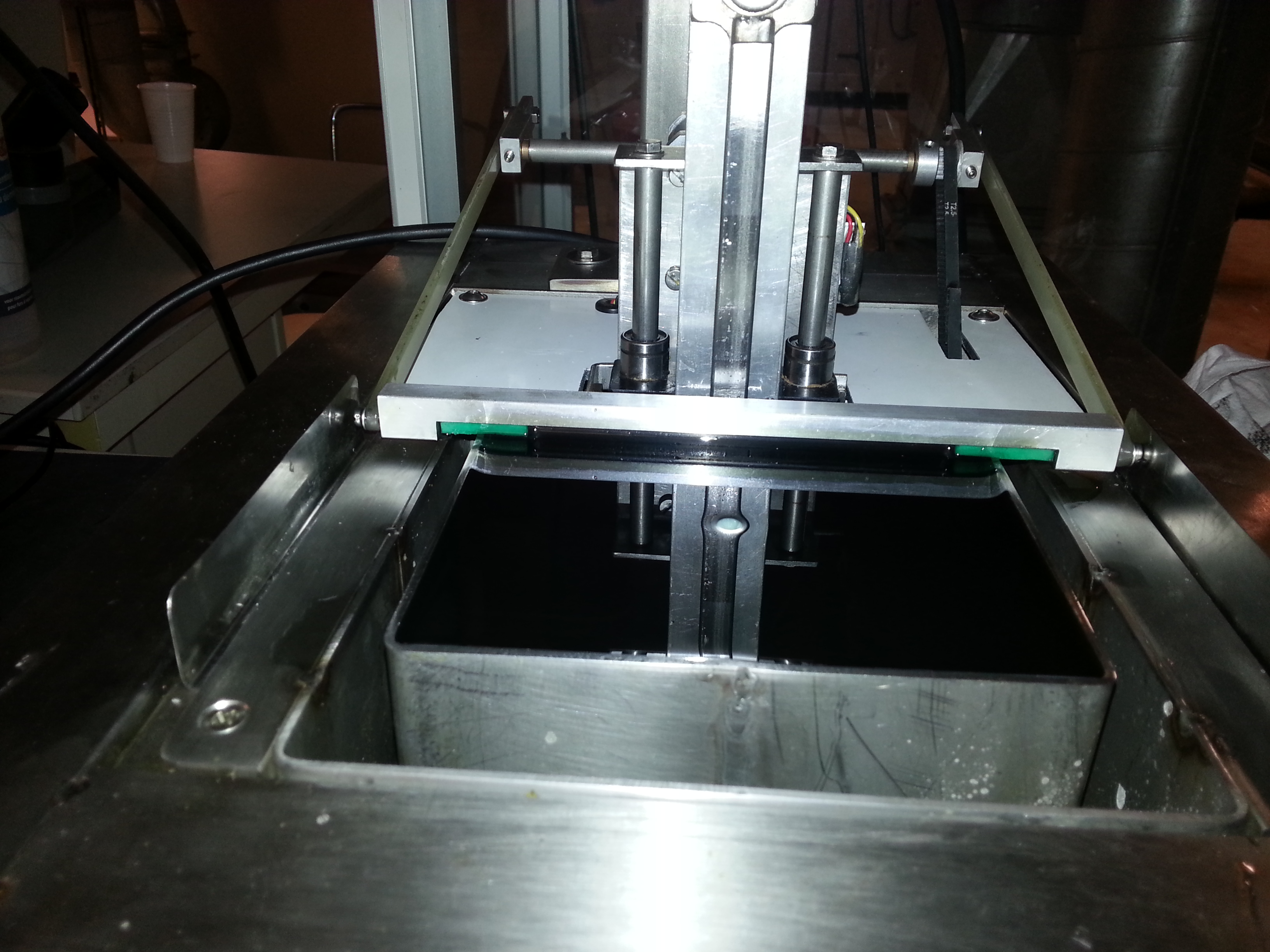 Hi, I made a quick drawing of what i mean by the inverted U, its metal with thin walls, as thin as possible, i made the walls from 0,3 mm steel. The wiper (recoater) is making a single forward or backward move after each illumination. This way the dent in the resin above the lowered object is filled from the resin supply in the inverted U. This idea is not mine, search for recoater in combination with sla. I hope i made it clear, if you have any question, feel free to ask.