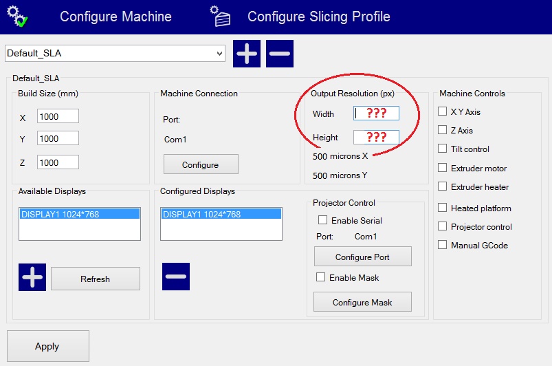 I have a prototype 1m X 1m X 1m machine and I can use a 500 microns extruder to build big 3D models...! But I can't setup the Width and Height in CreativeWorkshop to have 500 microns in the output PNG slices. It's not important for me if any PNG slice is very very big... it's ok for me, I need this...! Can you solve it...? If we can setup every custum Width and Height we want (and it's not important the real Display's resolution!), then everything is very easy...!