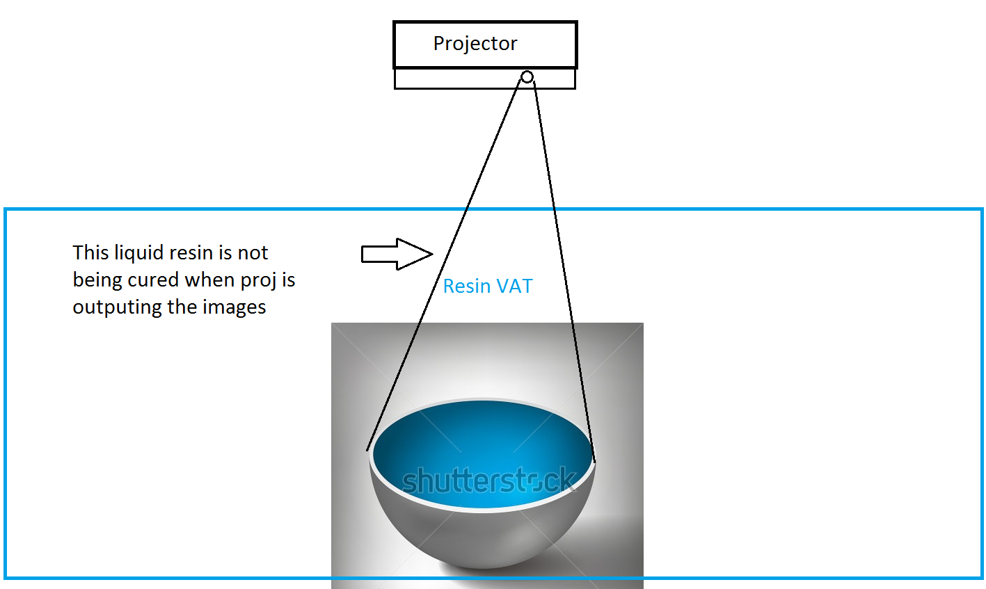 I get its a photo-sensitive resin that cures at ~350-450nm wavelengths, and that arc projectors can output those UV numbers. My question is, if the process is halfway through printing a hollow sphere, for example, how does the projector focus and cure only the object needed and none of the liquid resin between the projected image and WIP sphere.