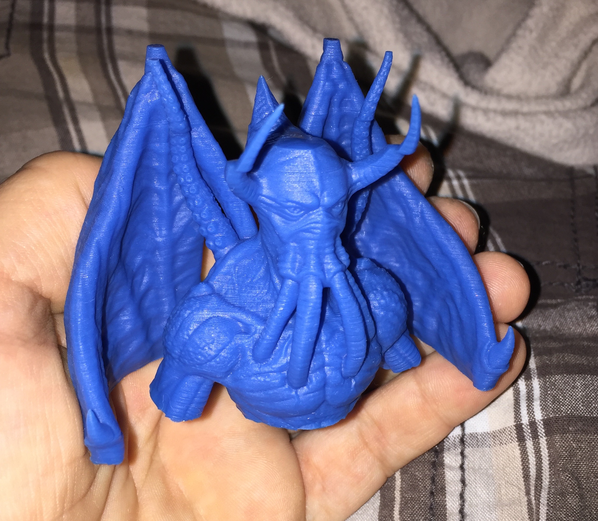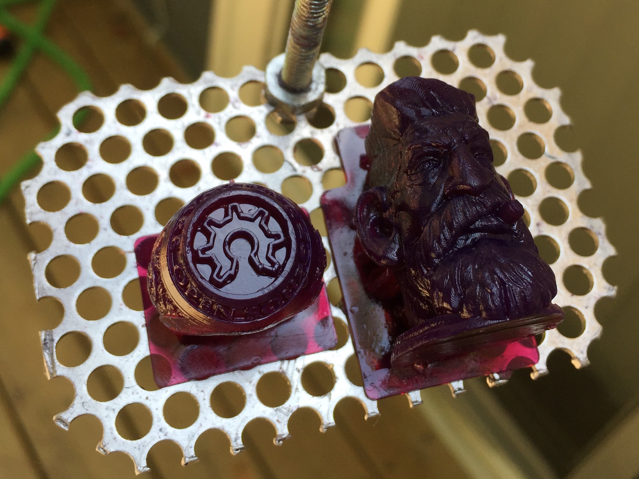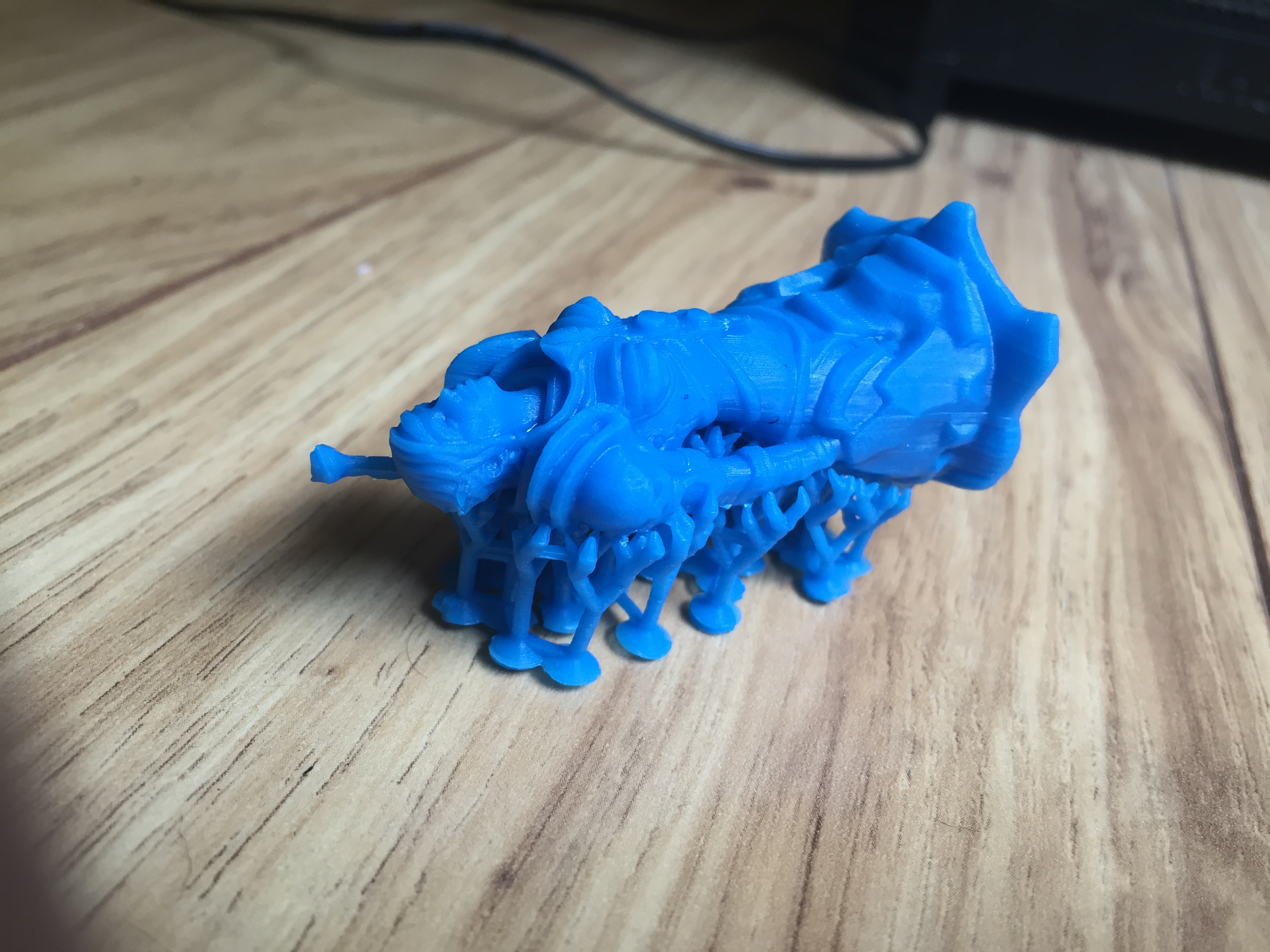 This was printed before I increased projector distance (60 xy 100z), wasn't able to complete the print because of some clearance issue. Tried to provide a little clearance on the fly and accidentally moved the build plate resulting in his horns and tentacles relocating. Fixed and made larger build plate with enough room for 250mm z build volume. Trying some maker juice g+ red resin soon to see how it works in my setup.