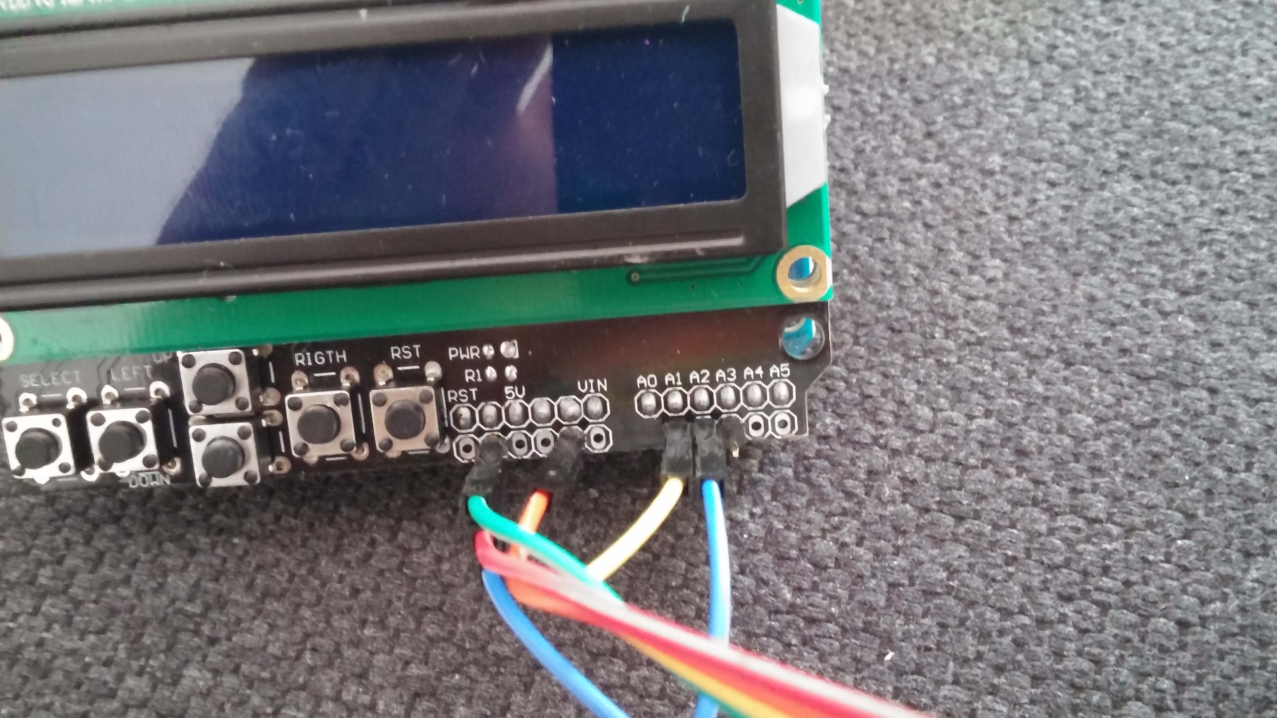 First step is to do a little bit of soldering. Solder the headers on to the breakout board. On the LCD shield you will need to solder a header on to the holes that correspond to pins A1, A2, the 3.3v source pin and a ground pin. I chose to solder 3 header pins on to the 3.3v output as you need to connect 3.3 volts to three things. If this seems a bit tricky for you, you can solder one then run a jumper to a breadboard then run the 3 wires from the bread board.