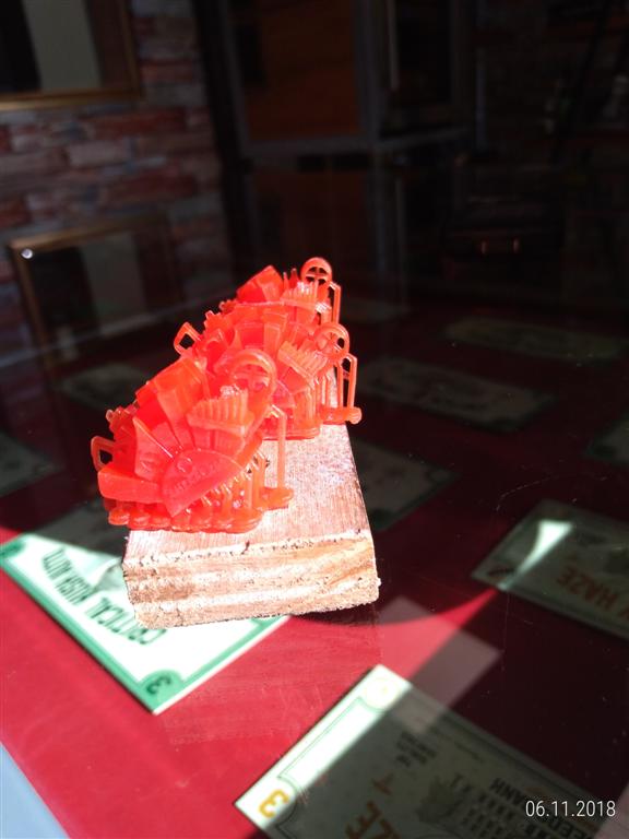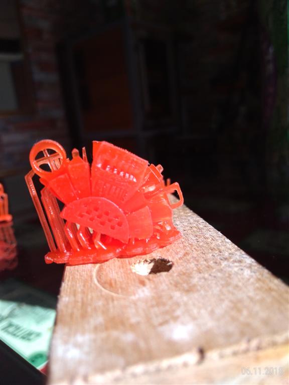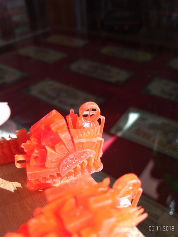 I enclose the first photos of the tests with the 31mm model. x 21mm x 10mm. all performed at 50 microns with exposure that goes from 3 sec. at 1.85 sec.e waiting between one slice and another of 10sec. We still have to work a bit on the times and other things but there are almost. Processing time about 1 hour and 45 min. for the 21mm. of height of the object without noise and practically no harassing odor. (the photos are not the best). Soon other tests.