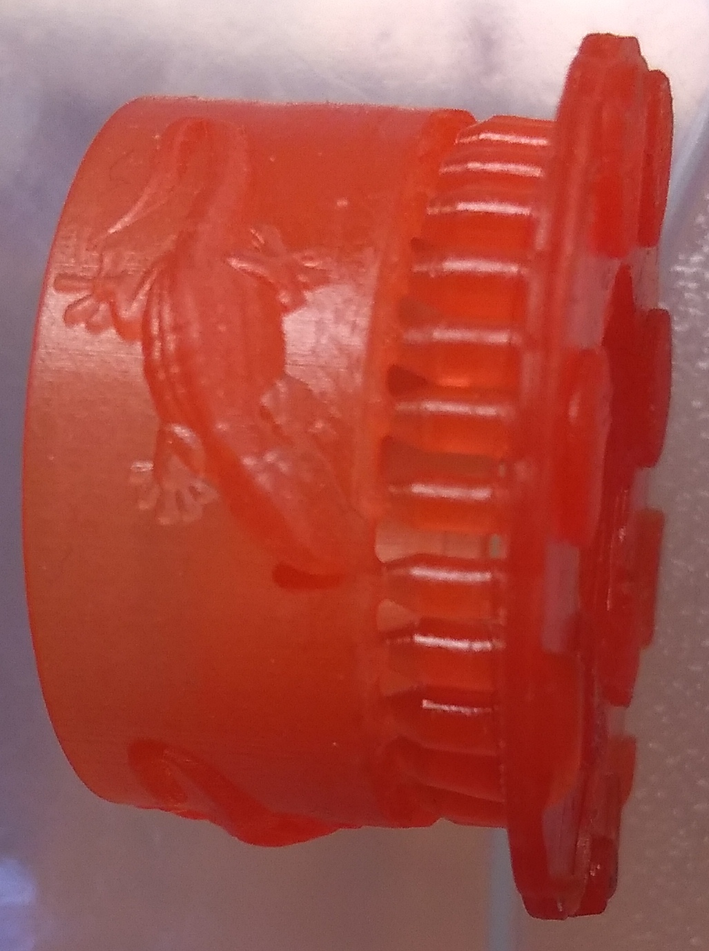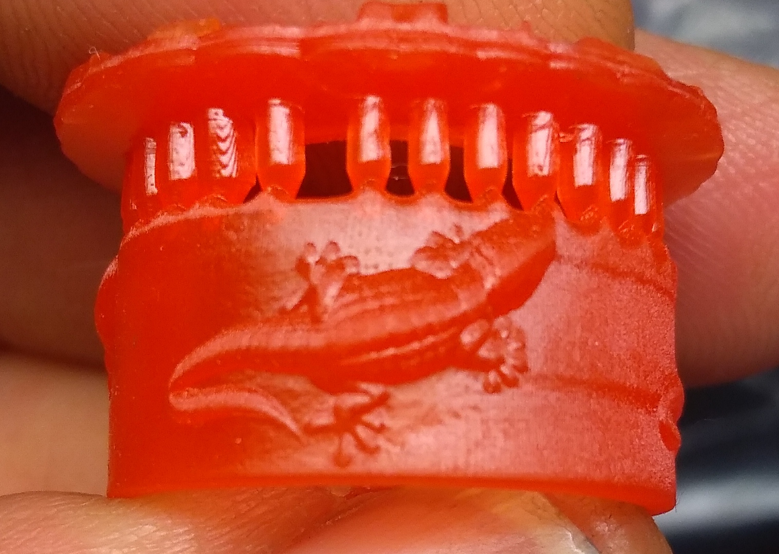 Here is the main problem that I find in the new test prints: the part towards the construction plate about half up is wrinkled and devoid of details while the upper part is well defined. The ring with the gecko on half of the circumference is wrinkled and the other half a part is wrinkled and the upper part perfectly smooth and well defined. Expression times are: exposure time 1.55 sec. (1.85 for the gecko) - bottom exposure 8 sec - bottom layers 3 - lift and sequence time 8 sec - slice tickness 0.050 mm.