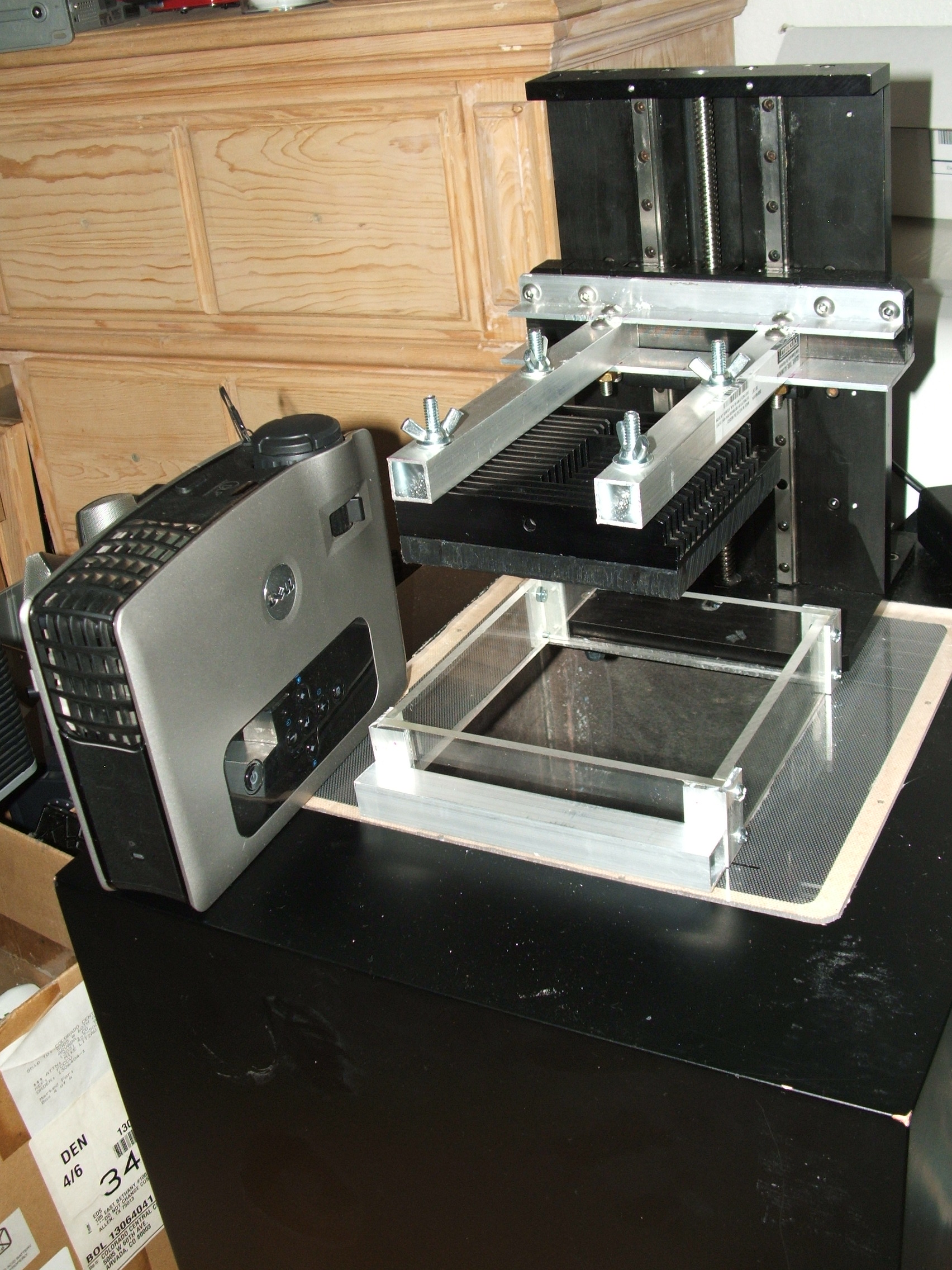 • The wooden box was obtained from a discarded sub-woofer enclosure. It has plenty of room for a projector. All the cabling and controllers will be placed inside for a more professional look. To prevent skewing, or tilting of the z-axis, it is reinforced with recycled aluminum plates on the bottom.