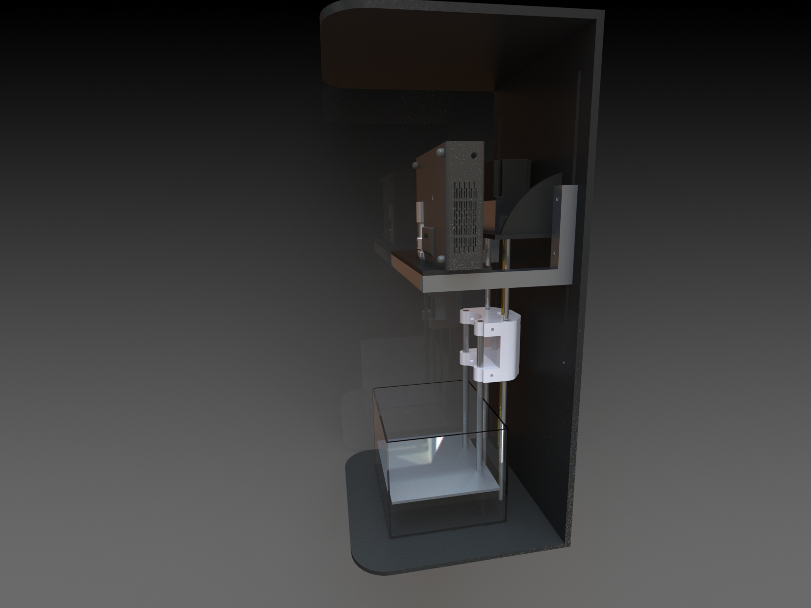 I currently have a CTC FDM machine and want something capable of printing higher quality parts but don't have the budget for a commercial machine. Since I have to construct it with as many bits as I have lying around I have been tinkering with a design for the project and think I may have something viable for a prototype.