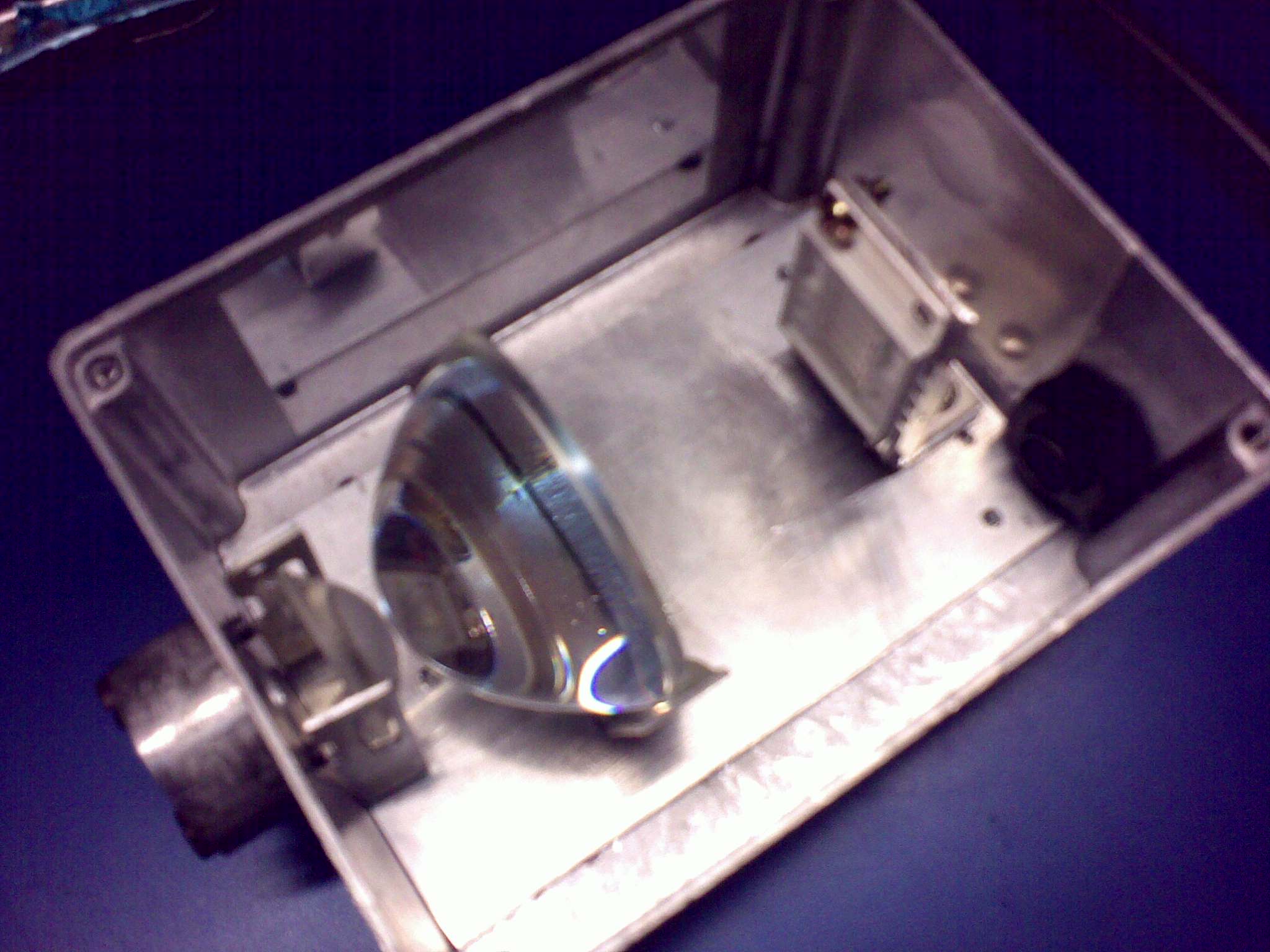 The box has one led initialy, but has holes ready for another if needed, the condensing lens was salvaged from an old projector, the second condesing lens came from a 1 watt led torch.